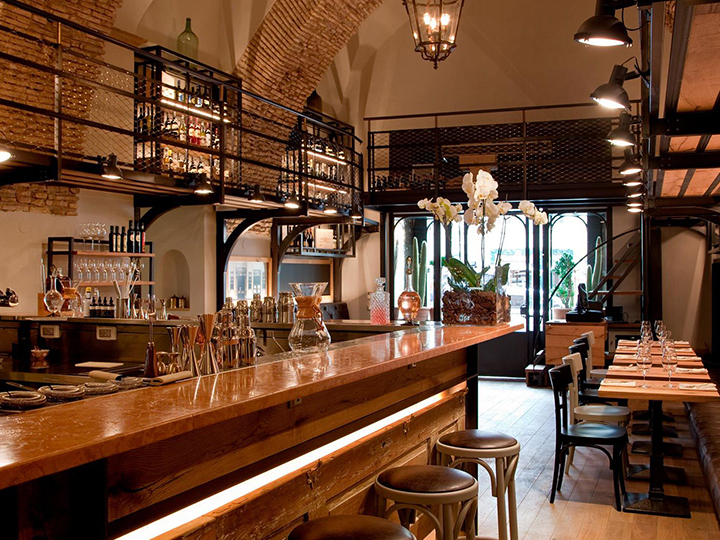 Già all’ingresso, verrete attratti dall’imponente bancone ad angolo, realizzato in legname di recupero e marmo rosso di Verona, circondato dalle bottigliere, dai tavoli in rovere con sedute in pelle, grandi specchi che esaltano volte e capitelli. Nella seconda sala, viene riproposta l’ospitale Saletta “Berardino”, scorcio che ricorda il fondatore del "Vini & Olii" aperto nel 1914. Tutta la location è stata ristrutturata solo con materiali autentici come ferro, legno e cuoio, linee essenziali, eleganza sobria e accogliente che preserva l’atmosfera di un tempo, anche attraverso un accurato restauro della struttura tardo rinascimentale, caratterizzata da imponenti archi di rinforzo del Settecento.