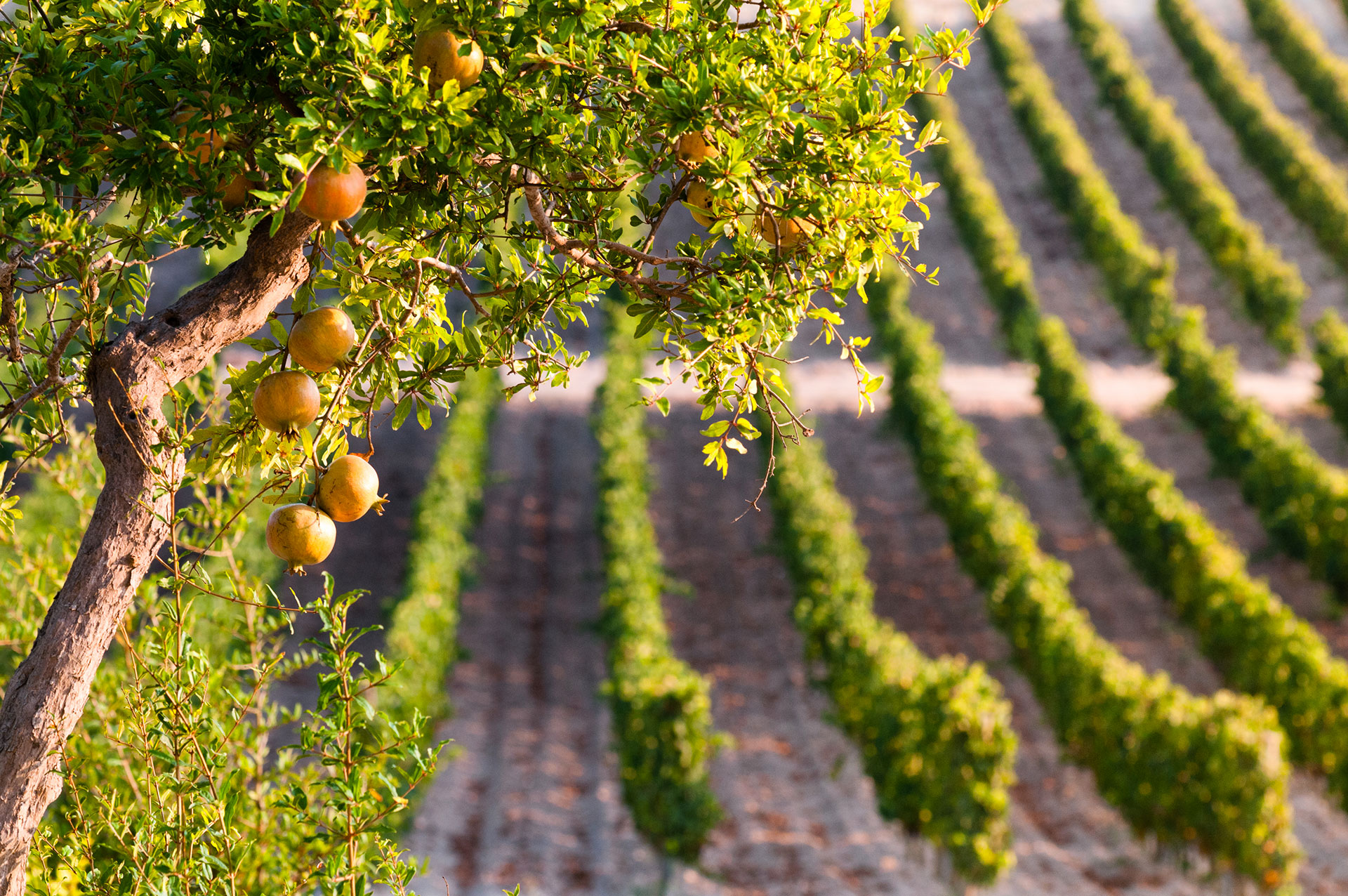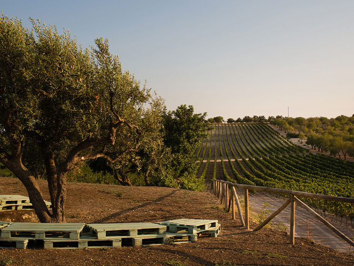 La tenuta si estende su dolci colline, dove le linee ordinate dei vigneti disegnano il paesaggio alternandosi a giovani mandorleti e a maestosi carrubi secolari. Ogni elemento contribuisce a creare un equilibrio naturale di grande fascino, che accompagna il visitatore in un’esperienza immersiva tra profumi, colori e silenzi della campagna siciliana.